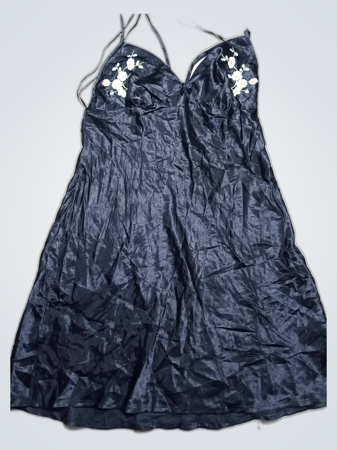 Black Satin Chemise with Floral Embellishments