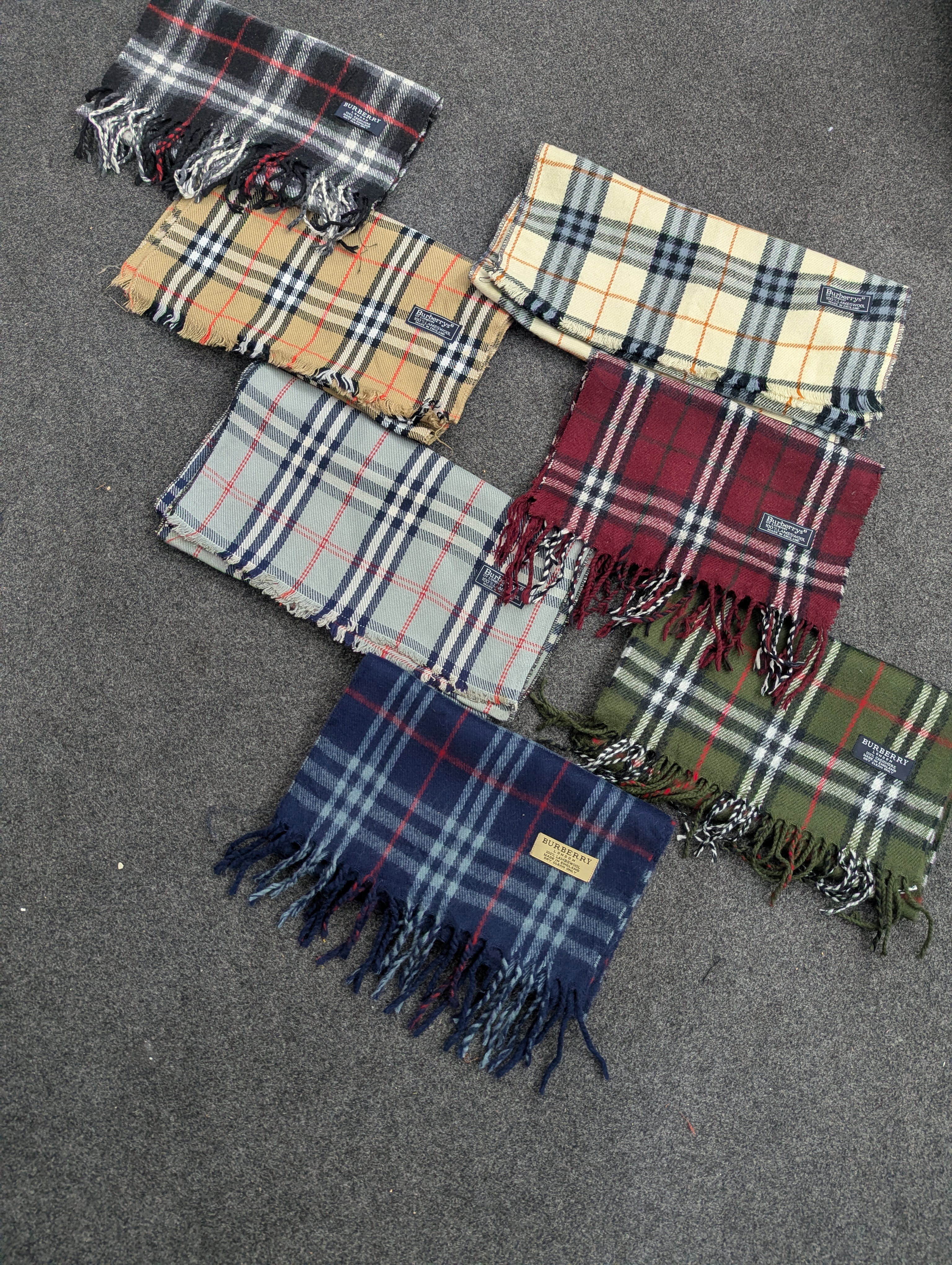 Mixed selection of style Burberry scarves. Each bundle includes pieces with short fringes, available in various sizes and colours.