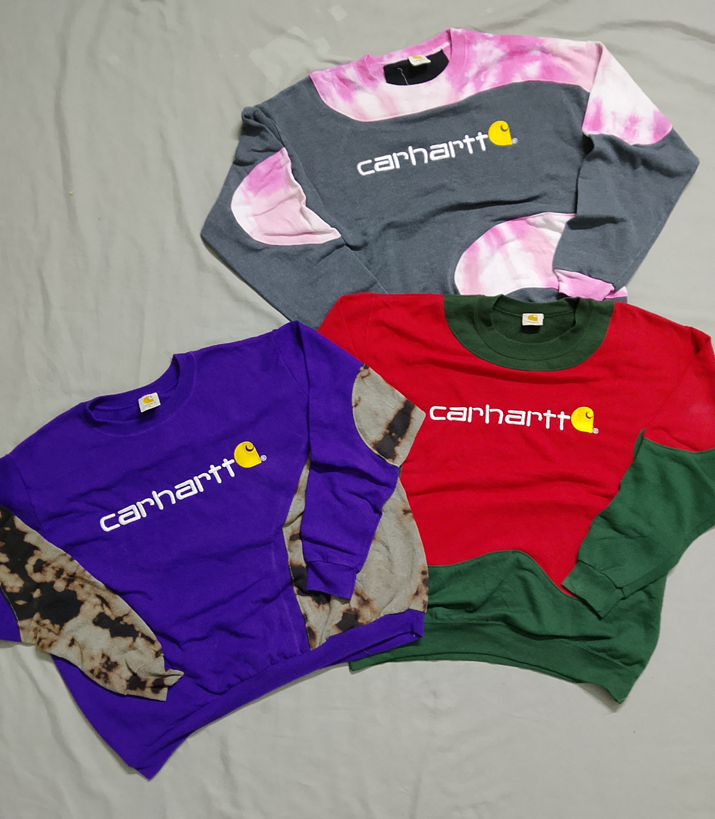 Carhartt Rework Style sweatshirt made from new cotton fleece material fabric with printed Carhartt designs. Production timeline is 3 to 4 days.