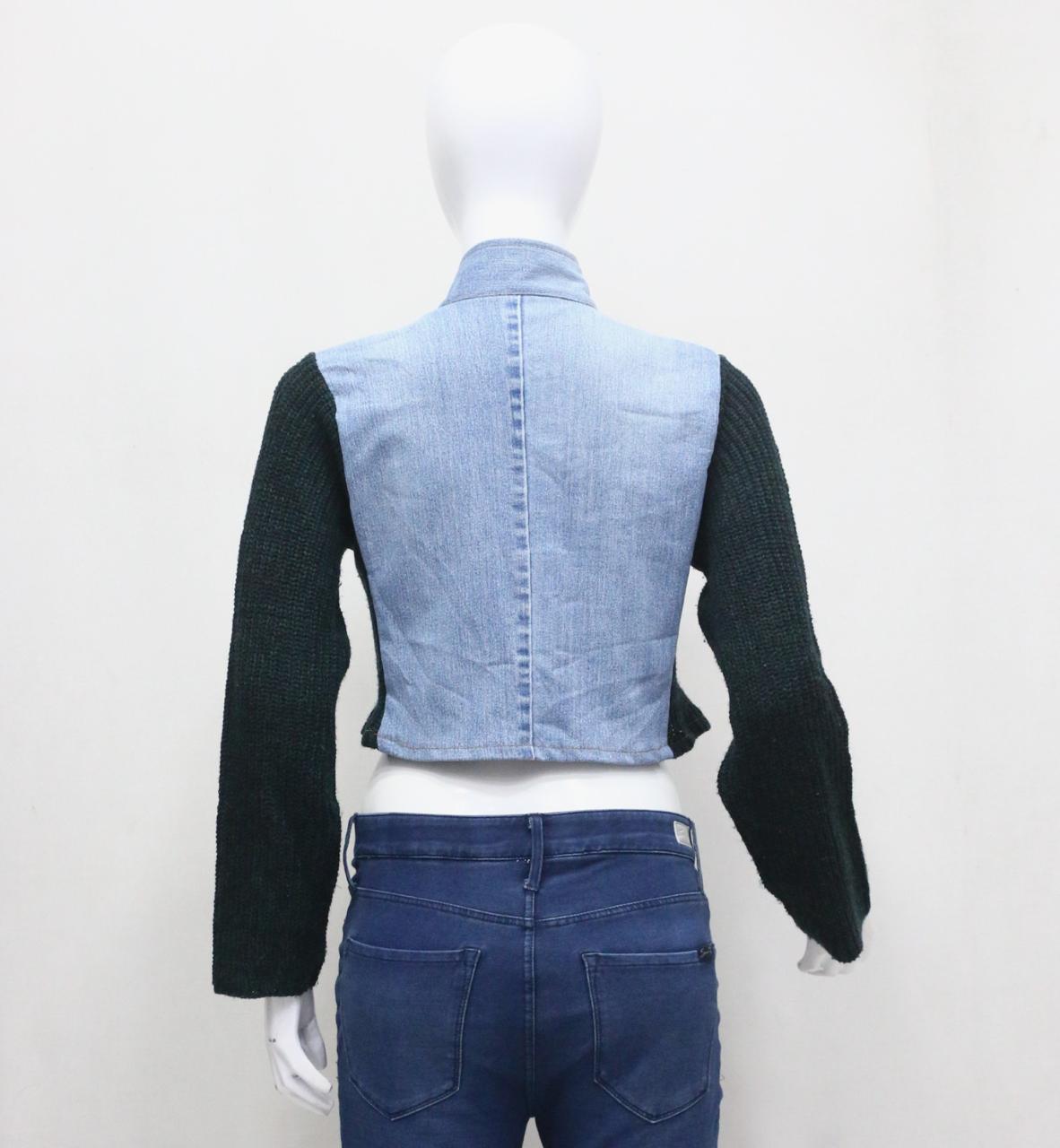 🧵 Mixed Fabric Construction – Denim body with knit sleeves