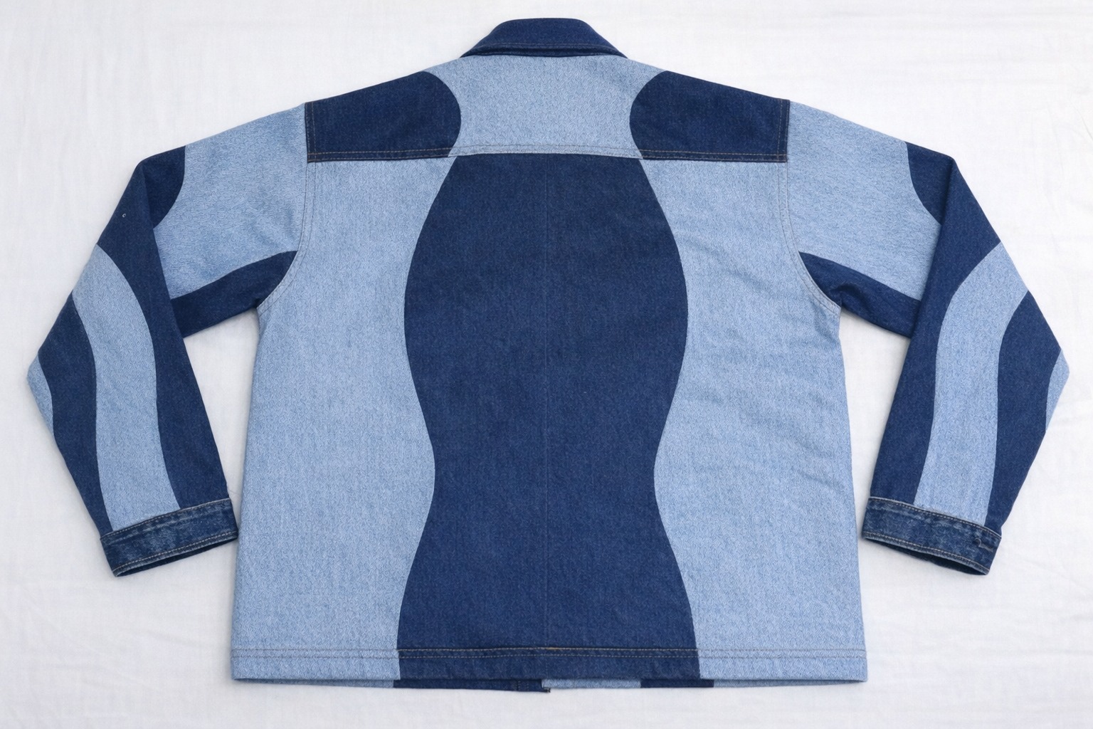 The front features bold vertical wave-style denim panels in contrasting light and dark washes.