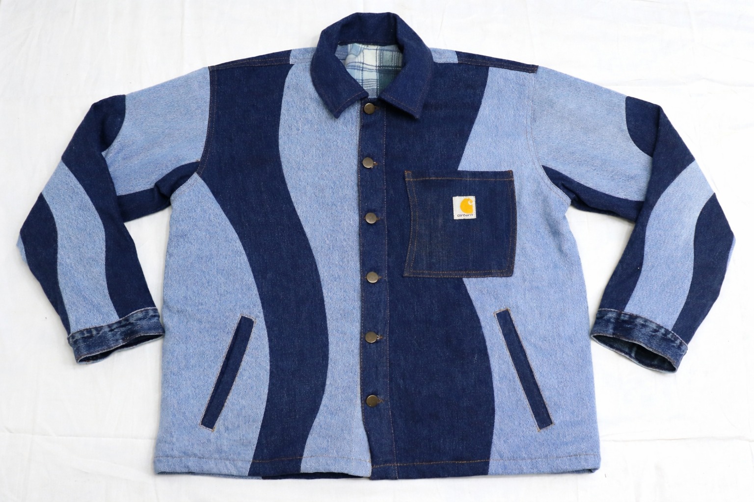 Each jacket is individually made using reclaimed denim. Panel layouts and wash variations will differ.