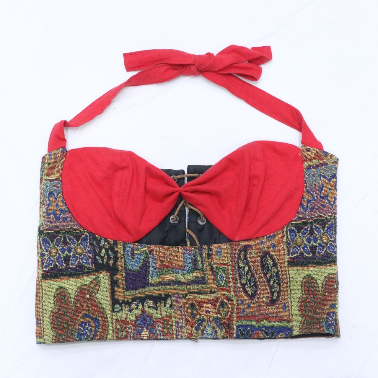 Embrace sustainable style with this one-of-a-kind boho halter top, thoughtfully upcycled from high-quality fabrics to create a piece that is as unique as you are. The top features a ruched red bust that adds texture and flattering volume, paired with a contrasting wide band showcasing a vibrant, intricate paisley pattern. The playful mix of colors and patterns makes each piece stand out, ensuring that no two tops are ever alike.