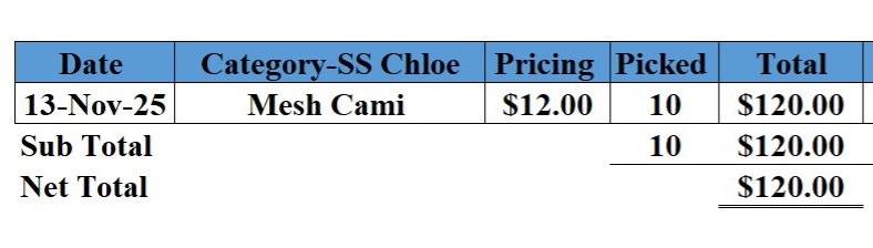 Title: Mesh Camis 10. All our customised orders go through a two step thorough quality control process and we try to ensure that every item dispatched is of grade A quality. Since these items are hand-made and customised as per customer requests, they are all unique and will have variations in size and style. They have been made using all recycled material and we account for a 10% margin of errors and damages because all the raw material used for production is vintage or second hand fabrics. We have units that mend, wash and repair items to their best of their ability and we try to ensure that we send A grade quality productions to all our customers However; if complaints and issues do come up, please ensure that you have your box tracking numbers, and labels saved and separated as per shipments so we can track which unit the issues are from. There is also a 3 week timeline from the time a parcel has been delivered to lodge the complaints. Please cooperate on these so any issues can be solved in a timely manner. The additional charge that you are seeing on top of our unit costs is the shipping charge that fleek adds on based on their in app shipping calculator. As suppliers, we plug in weightage and number of units, and the shipping price per unit is added on which is then added on to your invoice. We have no control over shipping costs, and for any concerns regarding this, it is best to reach out to fleek customer support. We look forward to sending across your order, and continuing to scale this relationship with great product and great service. Please note that all checkouts MUST happen within three working days of receiving the links after all changes have been adjusted and order finalised. We will not reserve or hold on to any of the items beyond three days. We appreciate your cooperation and look forward to dispatching all your beautiful selections efficiently and smoothly.