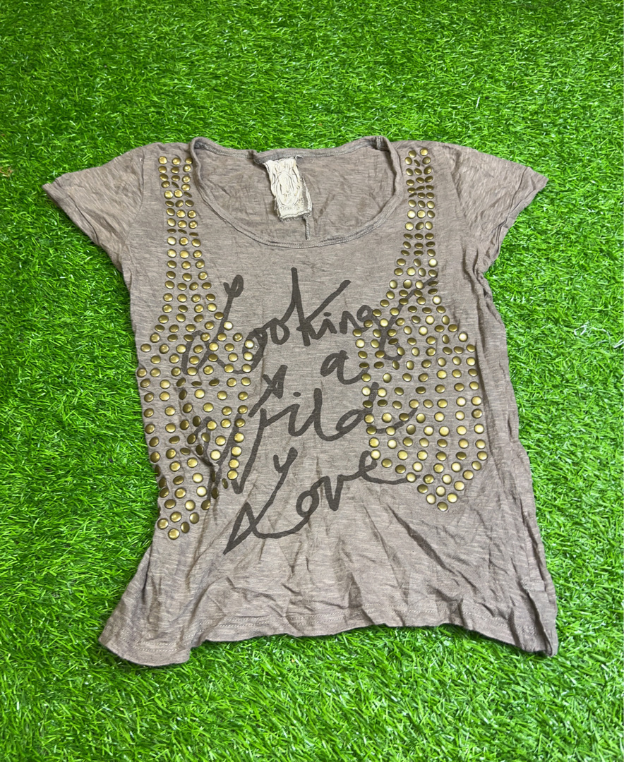 Gray T-Shirt with 'Looking for a Wild Love' and Gold Studs