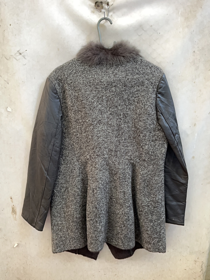 Grey Wool Blend Jacket with Leather Sleeves and Fur Collar