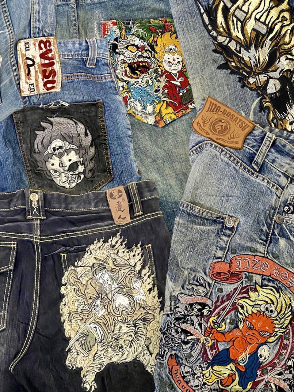 Hip hop baggy embroidery mix branded and unbranded jeans.
