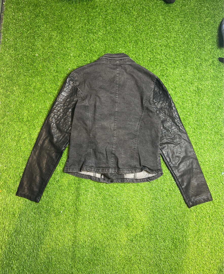 JustFab Black Denim Jacket with Leather Sleeves