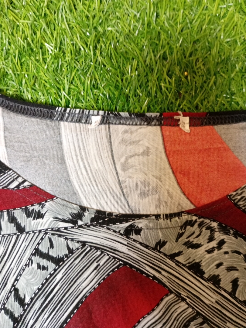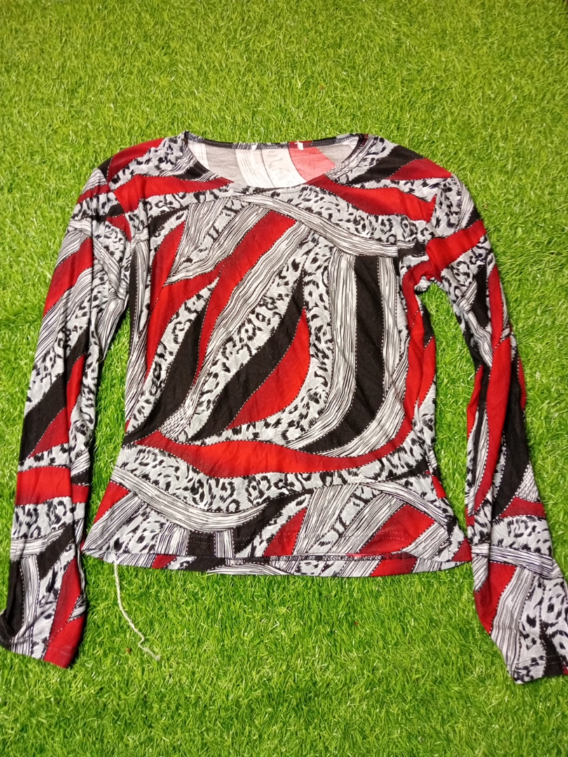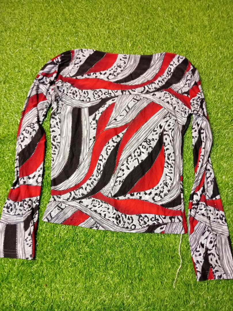 Long-Sleeve Blouse with Red, Black, and White Pattern