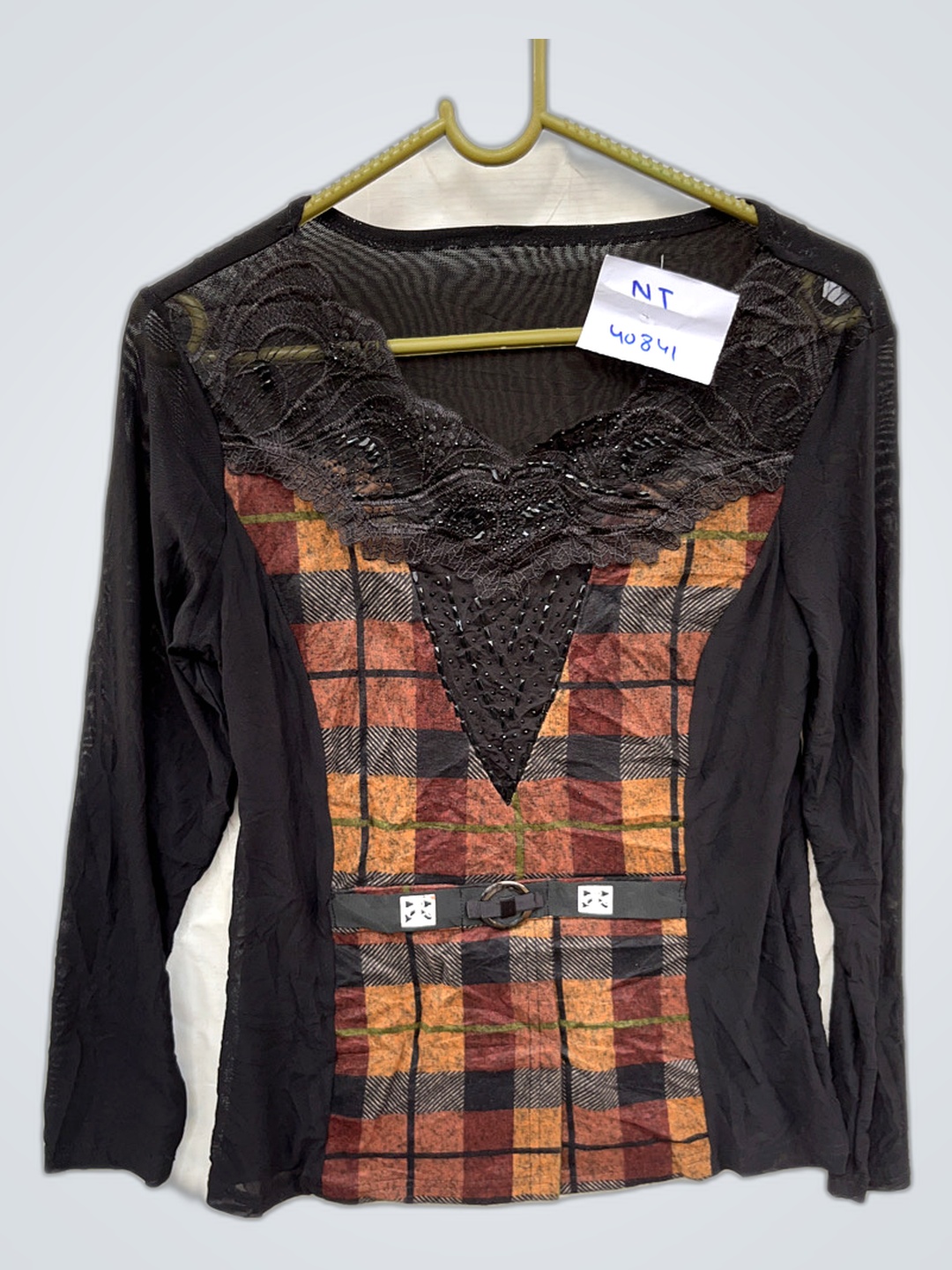 Plaid Lace Long Sleeve Blouse