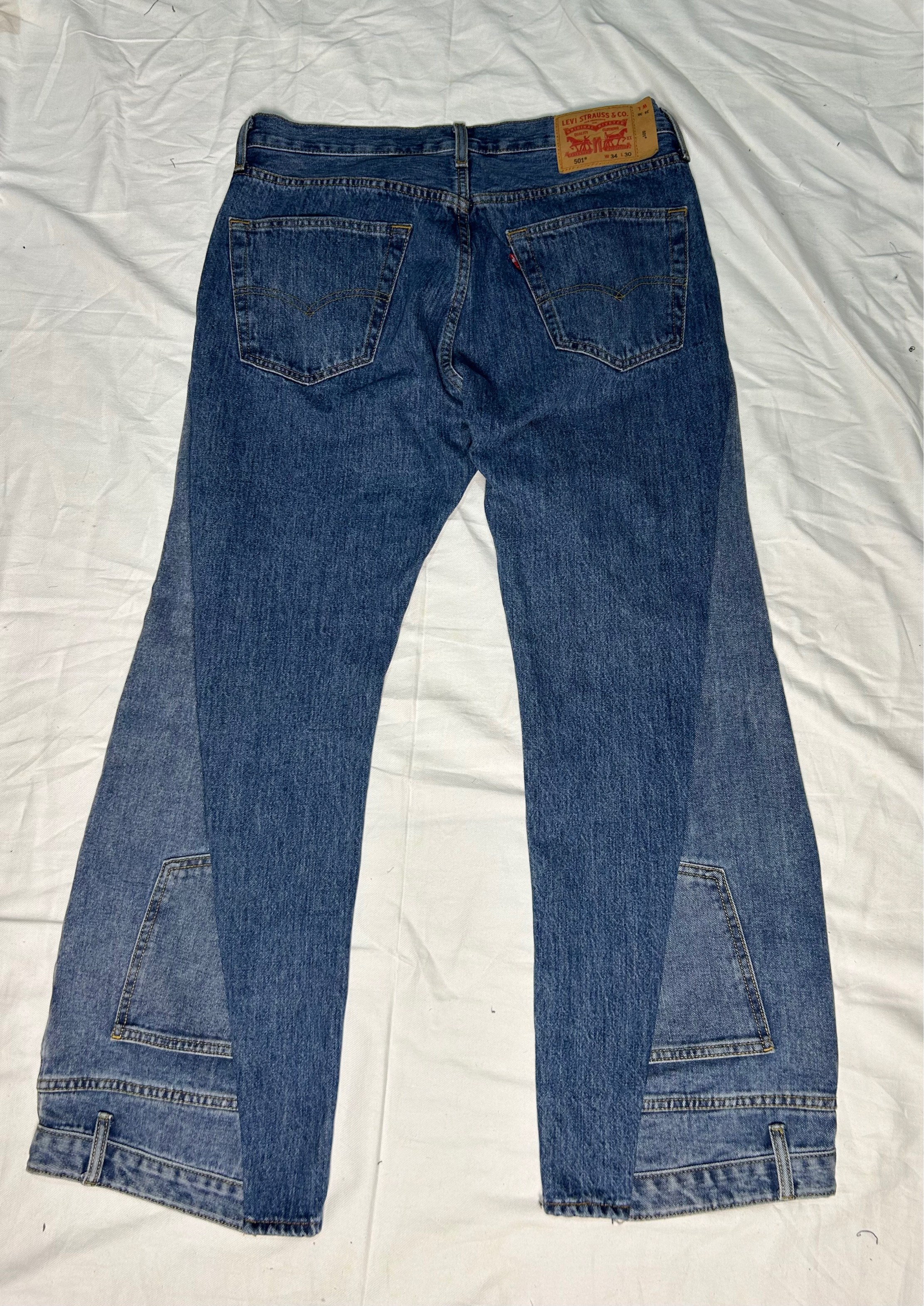 Crafted from two authentic vintage Levi's, Lee, or Wrangler (LLW), these jeans are a unique statement in sustainable fashion. A distinctive two-tone/split-leg aesthetic and bold silhouette are created by meticulously joining. Invest in art that can be worn and is truly unique.