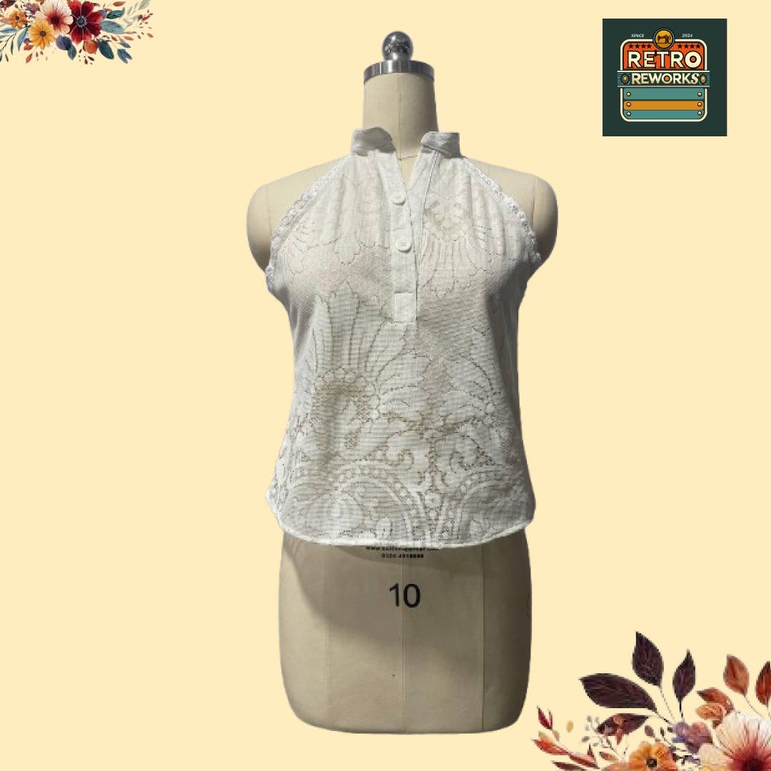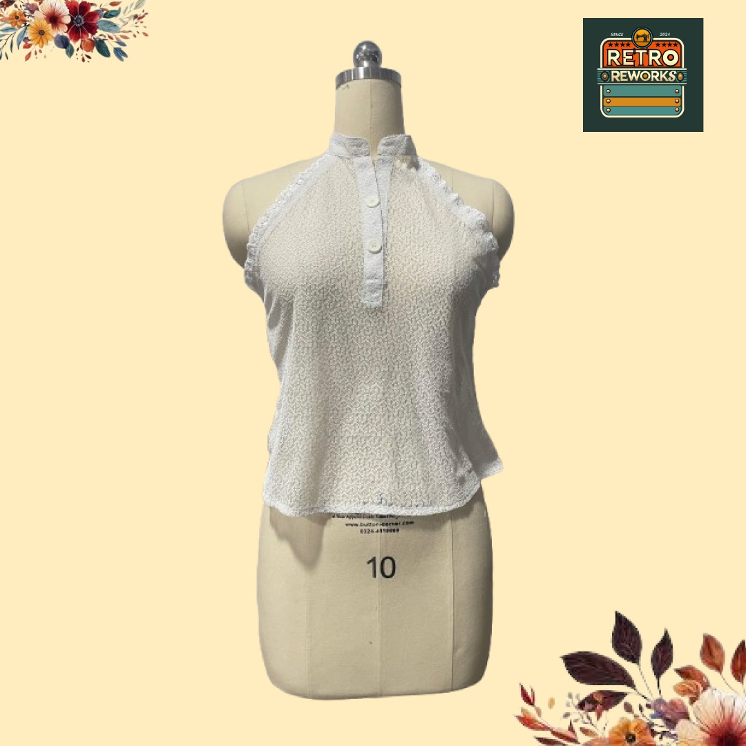 Delicate yet statement-making, this Upcycled Lace Front Button Halter Top is reworked from vintage lace curtain fabric, giving new life to beautifully textured material. Designed with a flattering halter neckline and functional front button closure, it blends soft femininity with a modern, reworked silhouette.