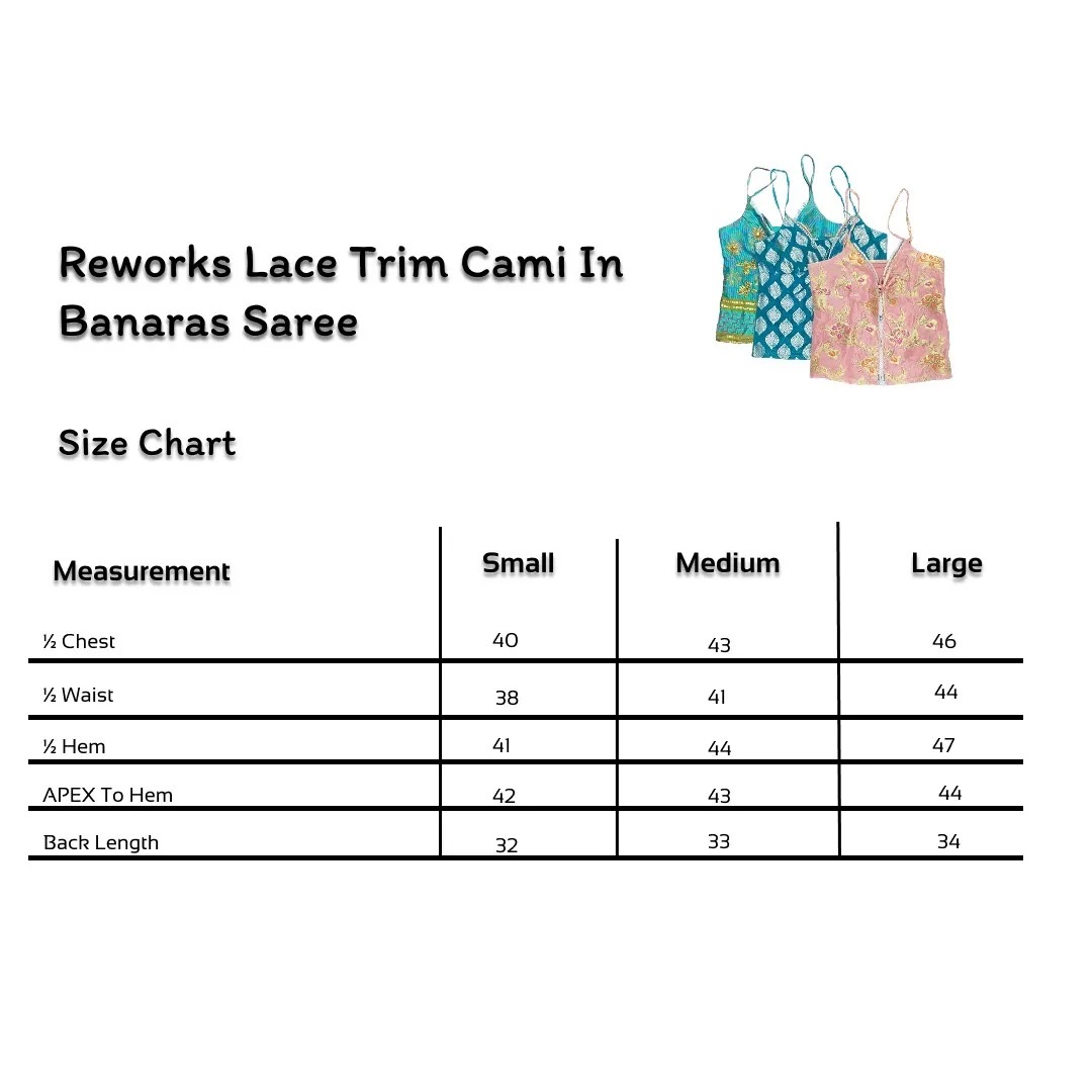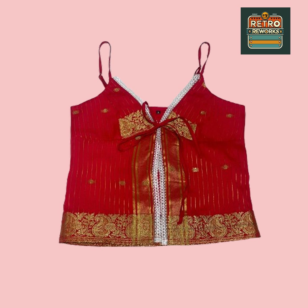 Elevate your wardrobe with this upcycled cami, crafted from an authentic Banarasi saree. Featuring intricate lace detailing and a luxurious silk blend fabric, this piece offers a perfect fusion of vintage elegance and modern style. Its lightweight, breathable feel makes it ideal for layering or wearing on its own for a statement look. Pair it with high-waisted jeans, skirts, or layered jewelry for a stunning Y2K-meets-traditional aesthetic.