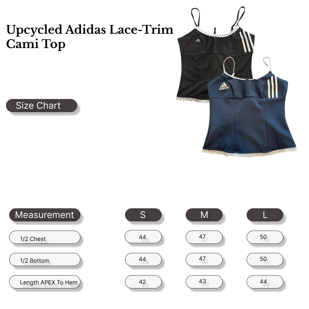 This Upcycled Adidas Lace-Trim Cami Top blends sporty heritage with a delicate, feminine finish. Crafted from repurposed Adidas sportswear, each piece features the iconic three-stripe detail and logo, reworked into a flattering cami silhouette. Soft lace trim along the neckline and hem adds contrast to the athletic fabric, creating a unique balance of streetwear and romance.
