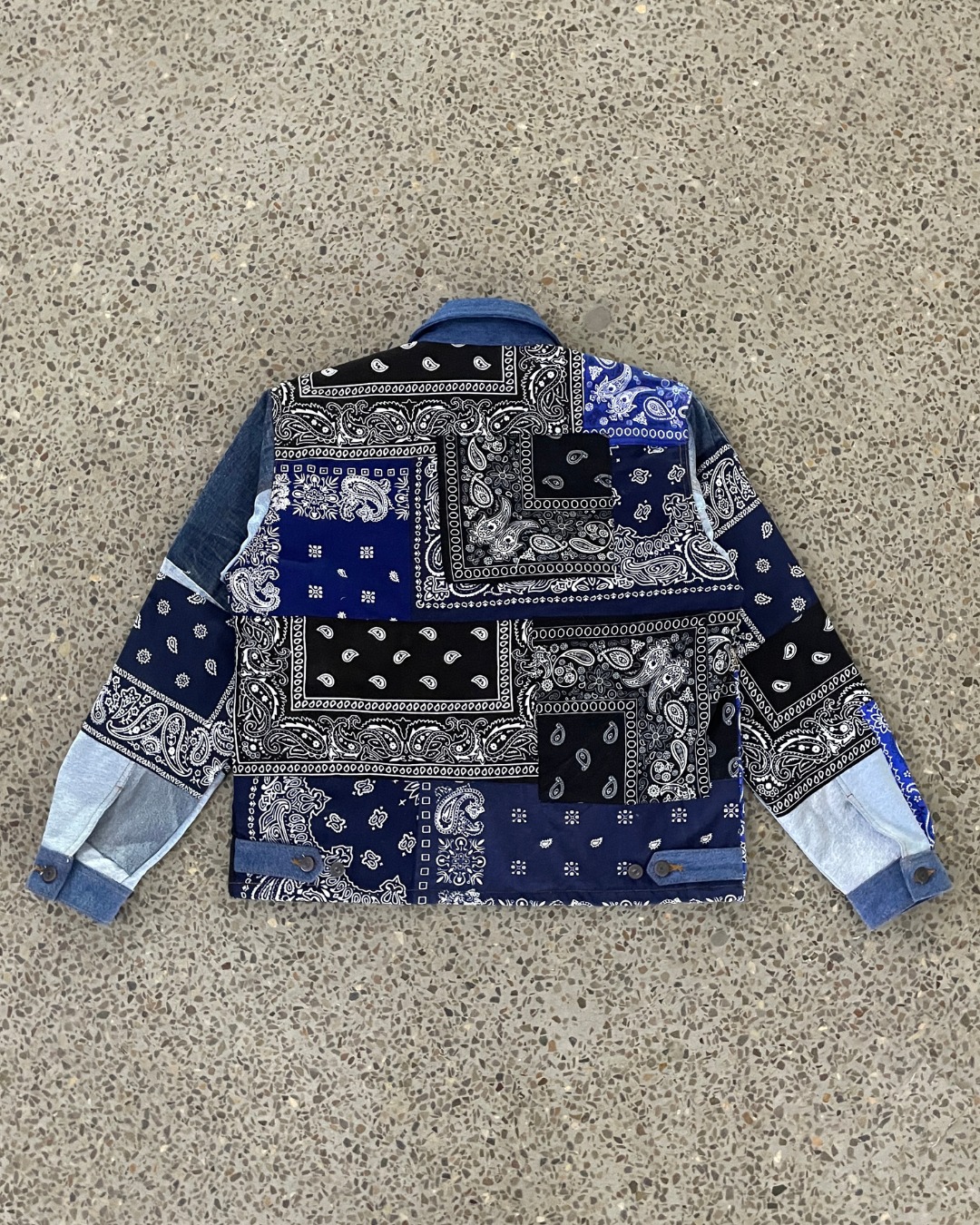 Material: Reclaimed denim base combined with repurposed bandana textiles