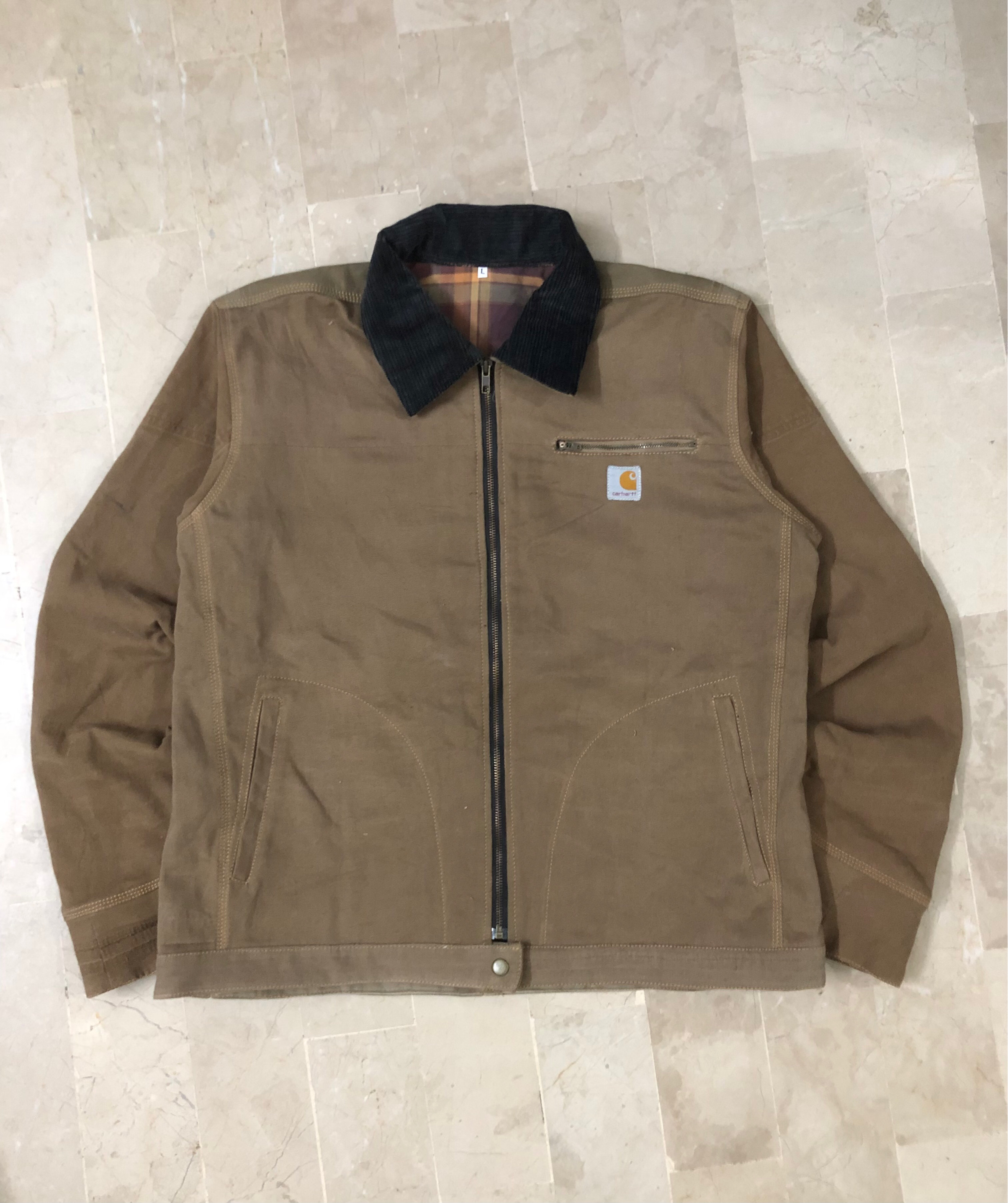Designed with a corduroy collar and soft flannel lining for comfort, this jacket balances toughness with wearability. It features a heavy-duty YKK zipper closure, a secure zippered chest pocket, and snap-button adjusters at the back hem for a customizable fit. The signature Carhartt logo patch seals its timeless workwear aesthetic.