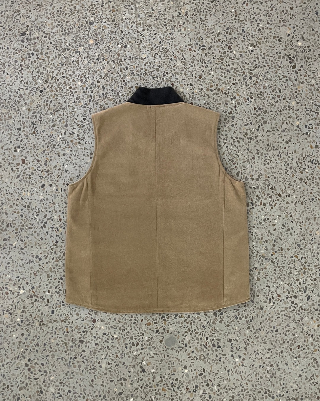This vest is rebuilt entirely from reclaimed Carhartt, transformed into a clean, structured utility layer. The minimalist front, oversized pockets, and bomber-style rib collar give it a modern, workwear-inspired finish while keeping the design timeless and functional. (Available in multiple colours and materials)