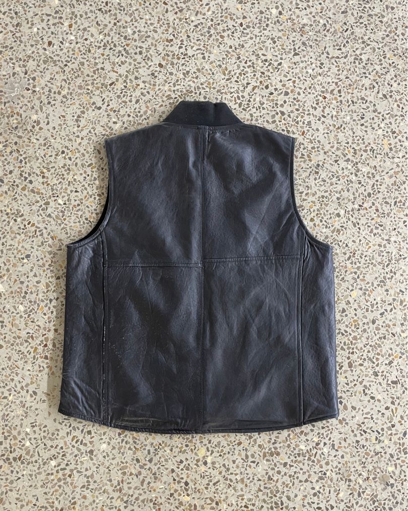 This Leather vest is crafted from reclaimed leather known for its durability and style. Reimagined with an upcycled approach, it keeps the classic utility feel while minimizing waste. The structured leather body, functional pockets, and sturdy zip closure make it both practical and timeless. (Available in a range of colours and materials denim, canvas [carhartt] parachute etc)