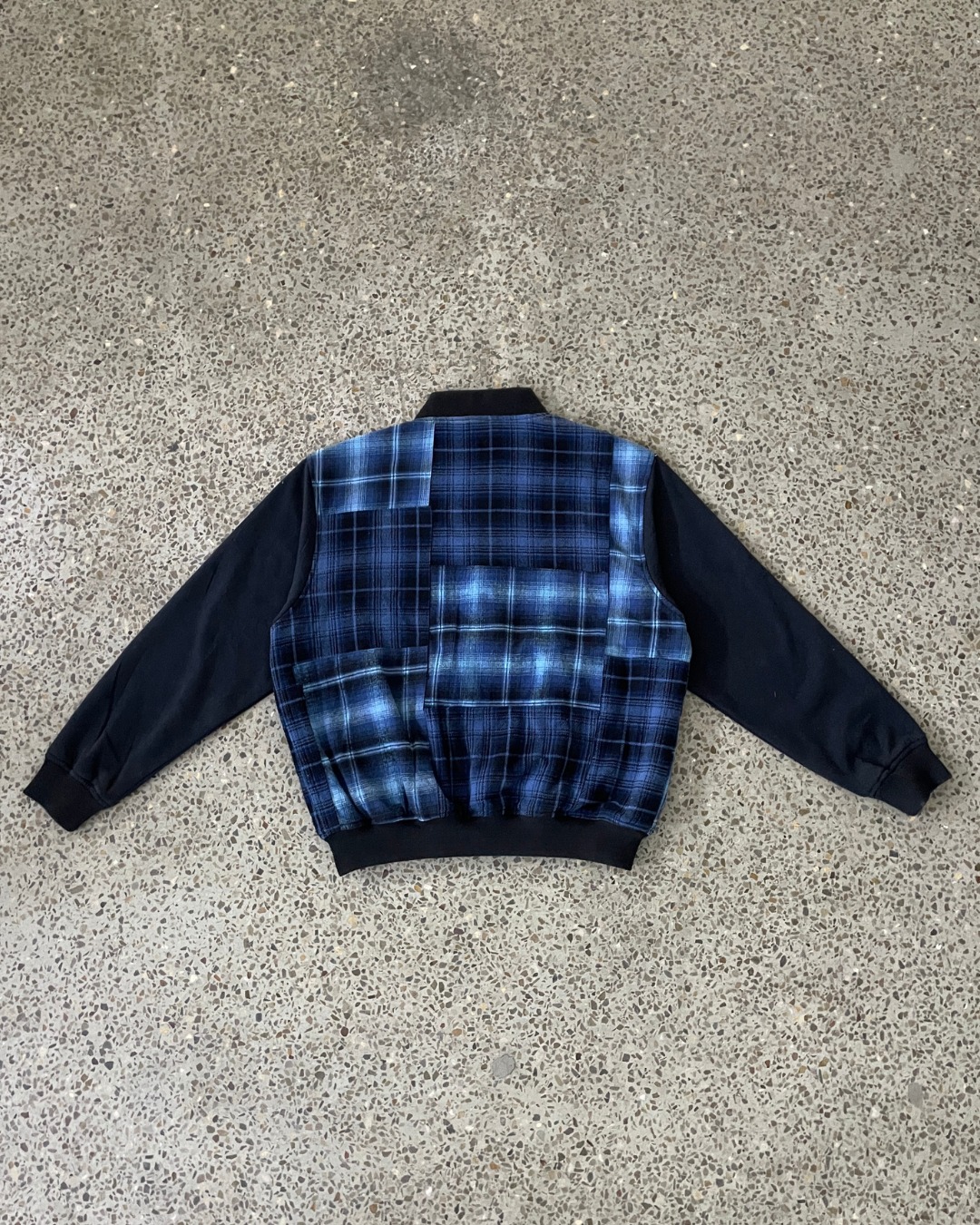 This jacket is reconstructed from reclaimed plaid shirting and sweatshirt fleece, reworked into a clean varsity silhouette.