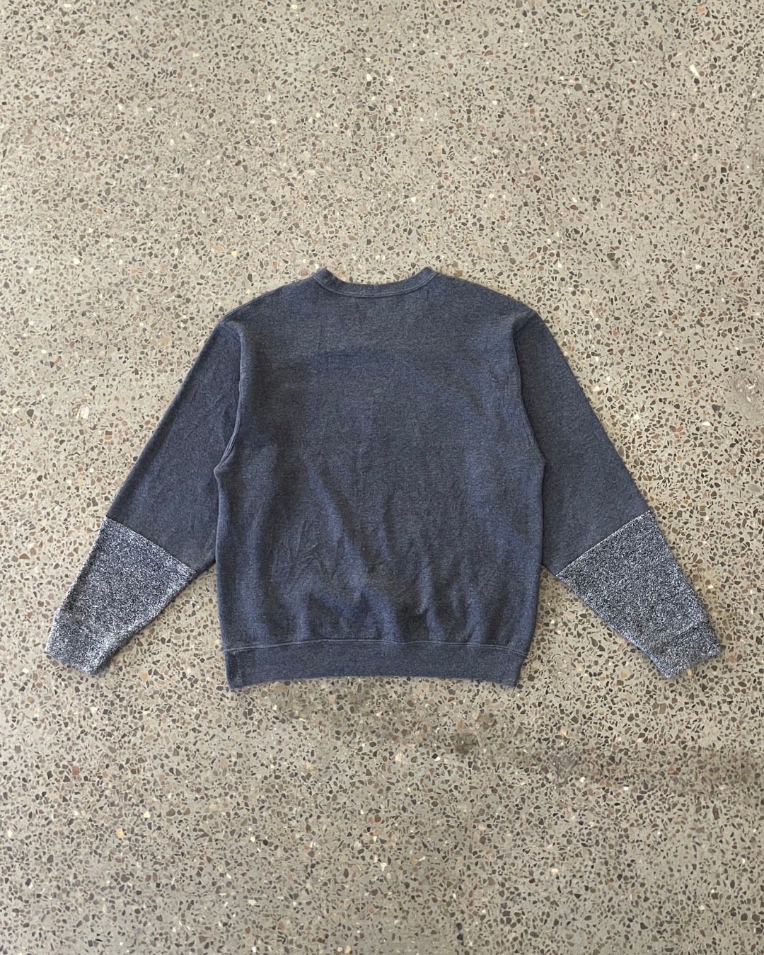 A reconstructed crewneck built from reclaimed fleece, merging classic varsity graphics with structured panel construction. This one-of-one piece centers a bold “WHS” athletic graphic across a heathered grey inset panel, framed by darker charcoal fleece for contrast and depth.
