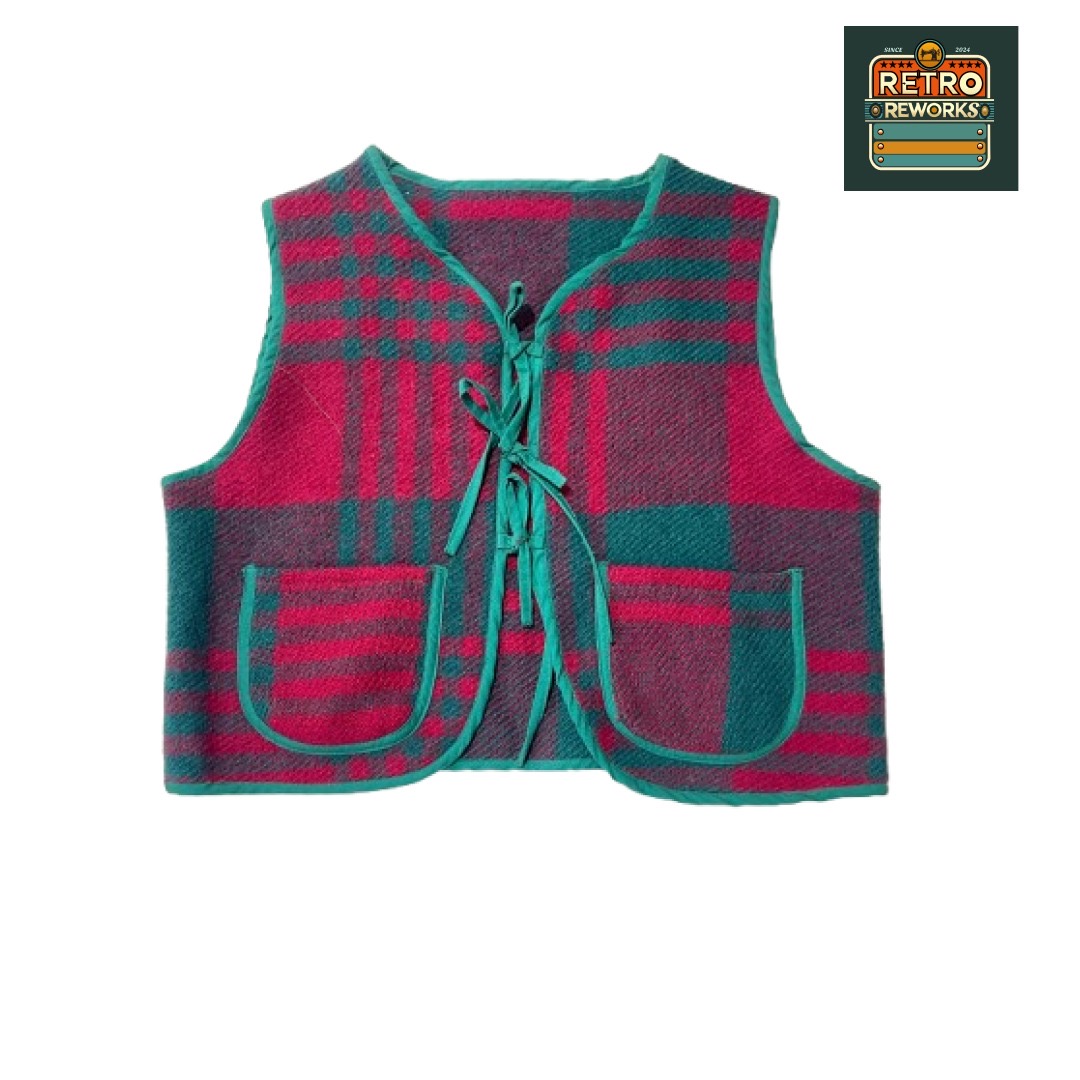 Upcycled Woolen Gilet Completely remade from woolen blanket with tie front.