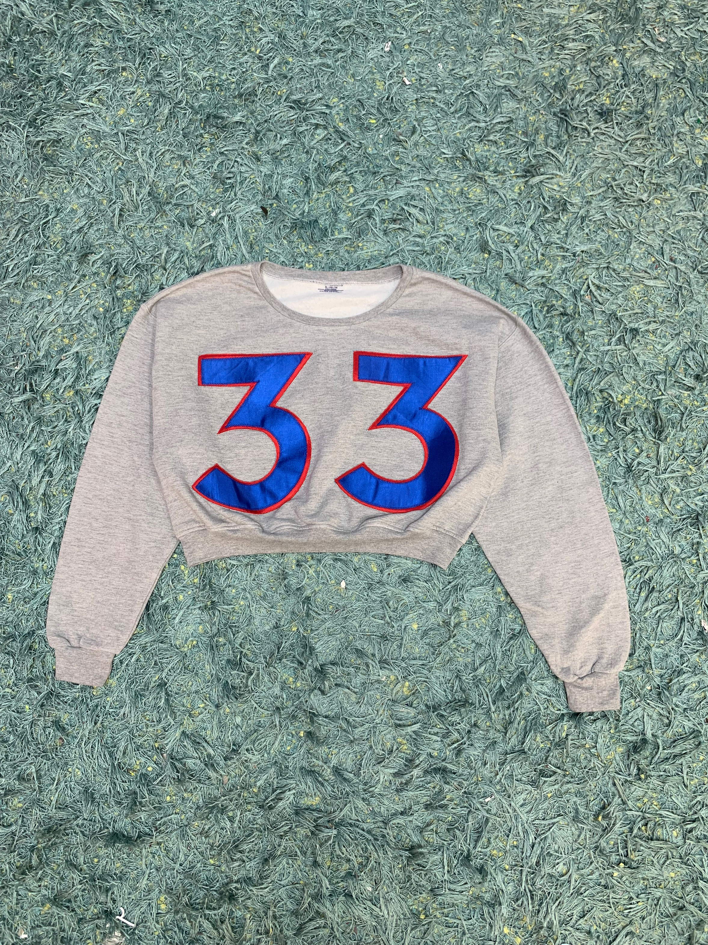 We upcycled unbranded sweatshirts and sports shirts, incorporating their logos to create this unique sweatshirt.