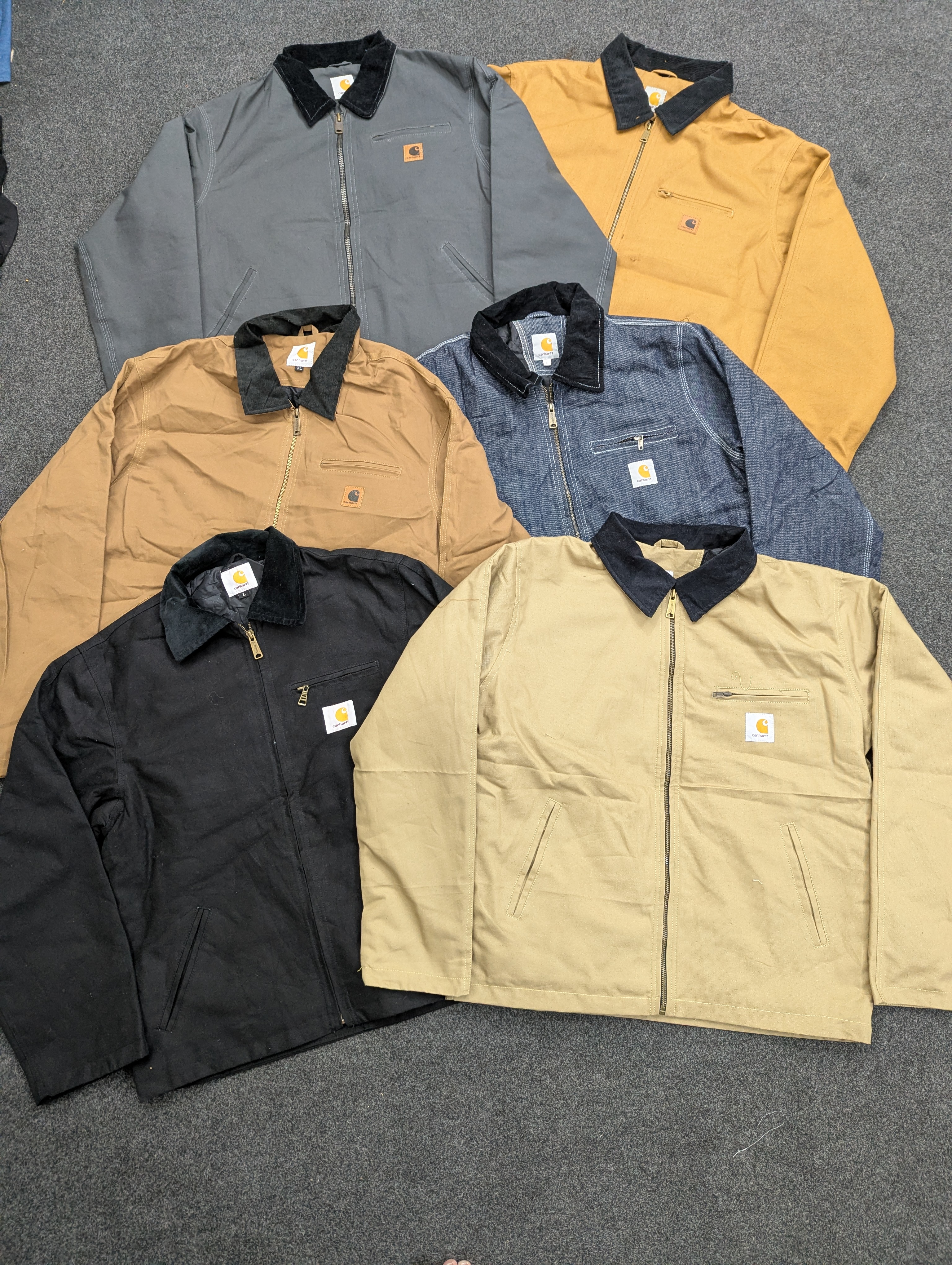 Vintage Carhartt Detroit Rework Style Jackets in a variety of colors like Camel brown, black, yellow, brown, grey and dark brown. Perfect for a rugged, vintage aesthetic.
